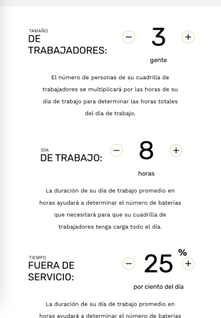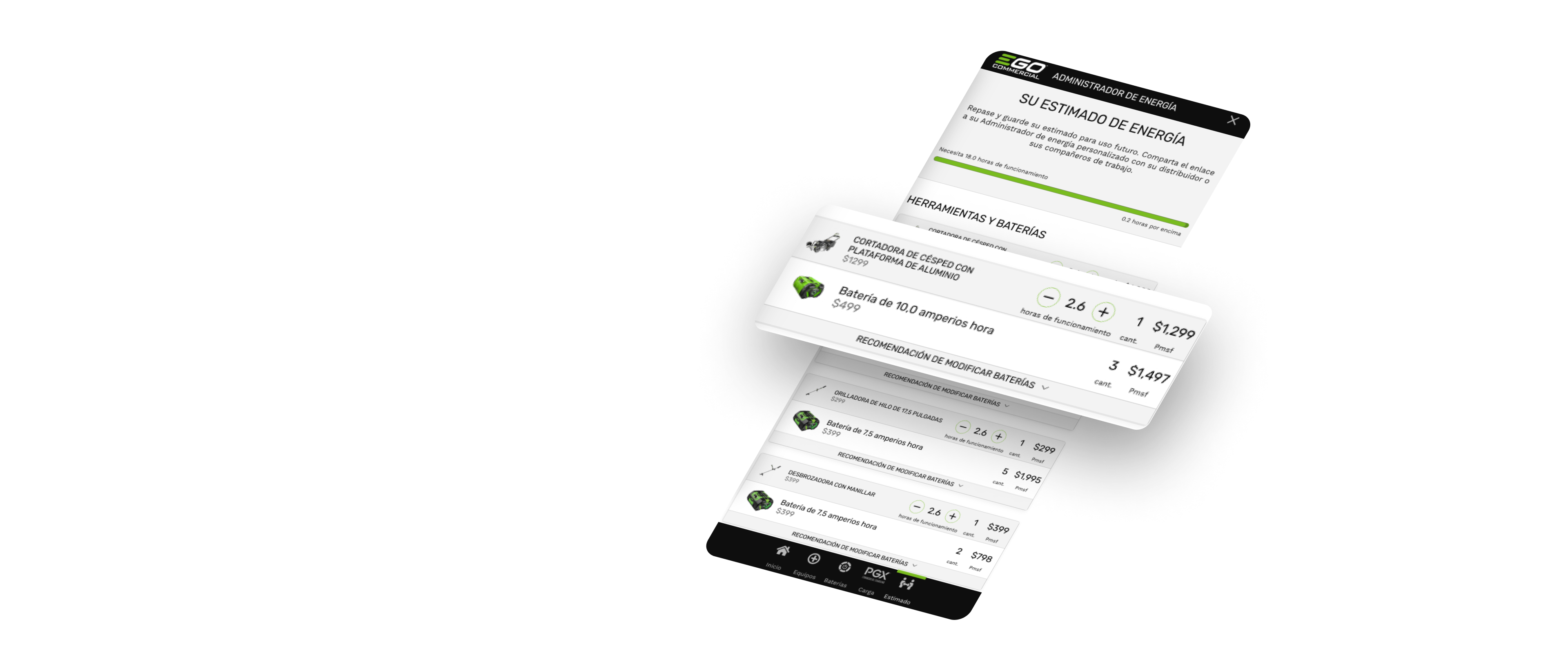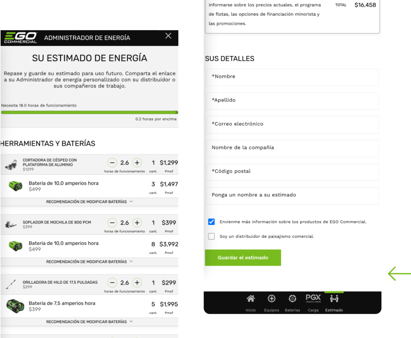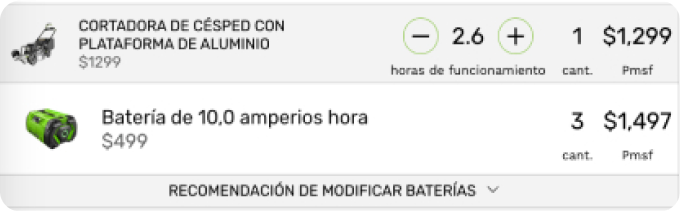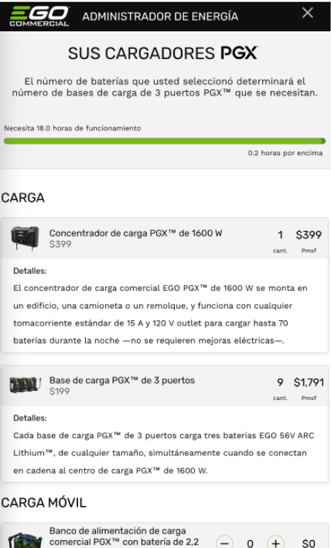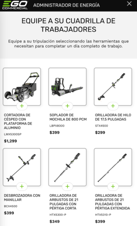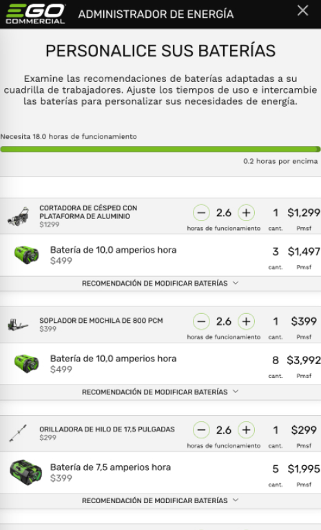 Responda algunas preguntas en el Administrador de Energía Comercial de EGO para tener una idea de las herramientas, baterías y cargadores que necesitará para su equipo y un estimado del costo de transición. También le ayuda a planificar para situaciones de alto consumo energético, como temporadas de lluvias con mucha vegetación y limpiezas de primavera y otoño.