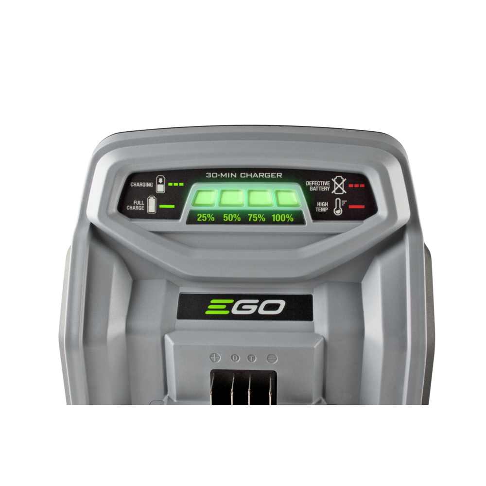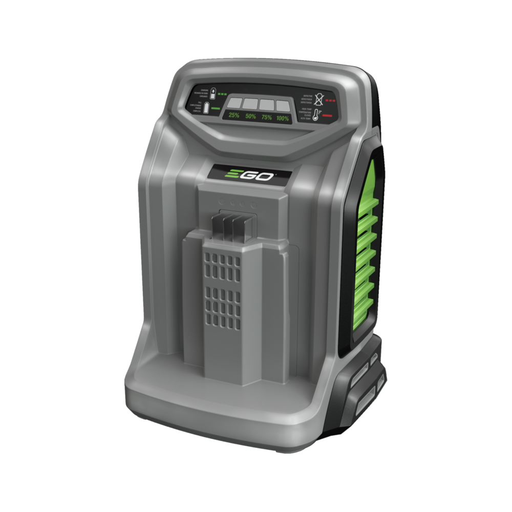 The EGO POWER+ Rapid Charger features an intelligent battery control system that monitors each cell’s charge and temperature to deliver the quickest, most efficient charge. Its active cooling fan system and advanced communication with the battery supports rapid charging without overheating for maximum battery life. Its rapid recharging capability ensures limited downtime with any EGO 56V ARC Lithium™ battery. It has an integrated fuel gauge that shows five charge levels in 20 percent increments. From zero, it can fully charge a 2.5Ah battery in as little as 30 minutes, 4.0Ah in 30 minutes, 5.0Ah in 40 minutes, 6.0Ah in 45 minutes, 7.5Ah in 60 minutes, 10.0Ah in 70 minutes, and 12.0Ah in 90 minutes (all charge times are approximate). The EGO POWER+ Rapid Charger charges all EGO POWER+ 56V ARC Lithium™ batteries.